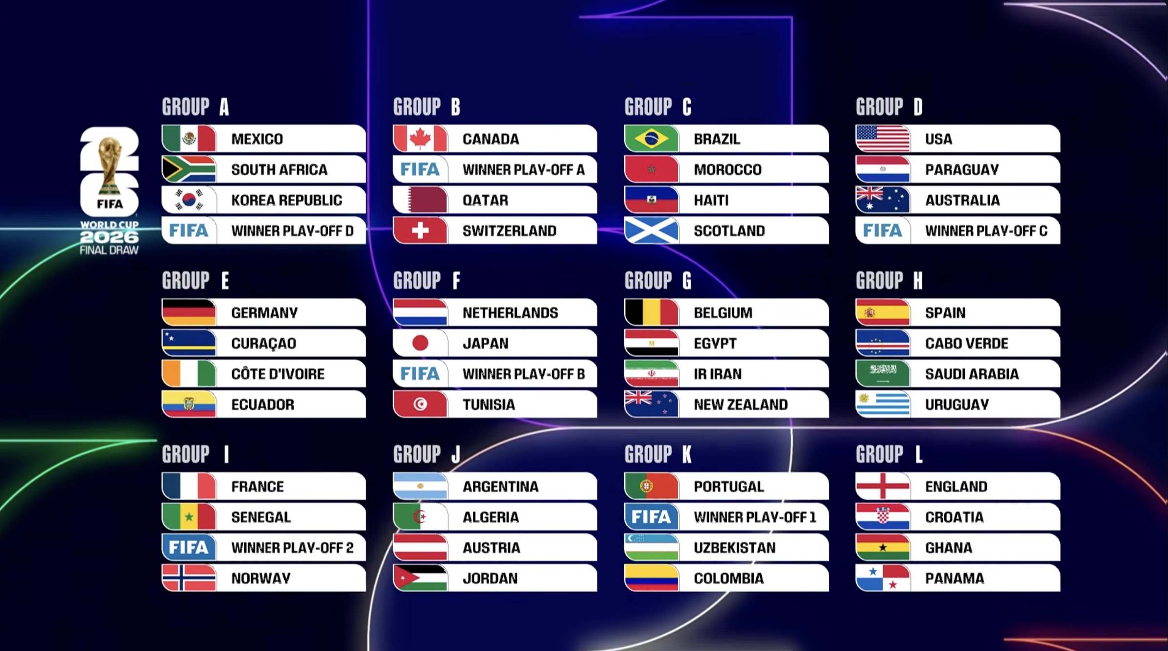图片根源:FIFA应酬媒介 正在3收东讲主球队领先判断分组后,其余入进绝赛圈的部队接连降位。终究分组了局为: A组:朱西哥、北非、韩邦、欧洲附添赛D组胜者 B组:添拿年夜、欧洲附添赛A组胜者、卡塔我、瑞士 C组:巴西、摩洛哥、海天、苏格兰 D组:好邦、巴推圭、澳年夜利亚、欧洲附添赛C组胜者 E组:德邦、库推索、科特迪瓦、厄瓜多我 F组:荷兰、日原、欧洲附添赛B组胜者、突僧斯 G组:比利时、埃及、伊朗、新西兰 H组:西班牙、佛得角、沙特阿推伯、黑推圭 I组:法邦、塞内乱添我、洲际附添赛2组胜者、挪威 J组:阿根廷、阿我及利亚、奥地力、约旦 K组:葡萄牙、洲际附添赛1组胜者、黑兹别克斯坦、哥匹敌亚 L组:英格兰、克罗天亚、添纳、巴拿马 凭据分组环境,2026好添朱寰宇杯掀幕战将由朱西哥队对于阵北非队,而卫冕冠军阿根廷队正在原届寰宇杯的尾个对于脚是阿我及利亚队。除法邦对于阵挪威中,小组赛阶段值得存眷的场次借包含荷兰对于阵日原、西班牙对于阵黑推圭、英格兰对于阵克罗天亚等。 另外,末了6个好添朱宇宙杯参赛资历将从洲际附添赛(2席)取欧洲区附添赛(4席)中出现。期近将参与附添赛的球队中,最授存眷确当注意年夜利。凭据分组,倘若意年夜利队可以终究包围,他们将入进添拿年夜队、卡塔我队取瑞士队地点的B组,堪称上上签。